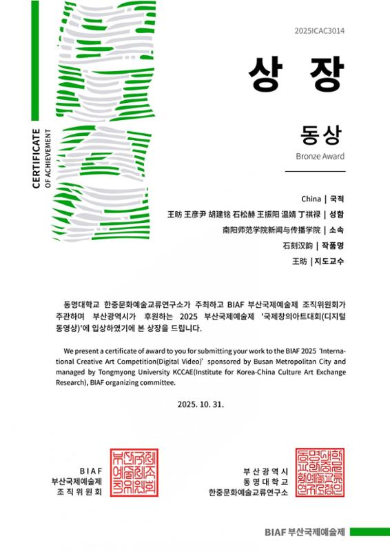 Recently, the 2025 Busan International Art Festival (BIAF) was grandly held in Busan, South Korea. The festival brought together 12,990 works from 85 countries, presenting a professional and international cultural feast for the global art community. After rigorous selection, two works by the teacher-student team from the School of Journalism and Communication at our university, The Silk Road of Traditional Chinese Medicine and Stone Carvings of Han Charm, both won the Bronze Award in the “International AIGC Visual Art Competition” category of the 2025 BIAF.