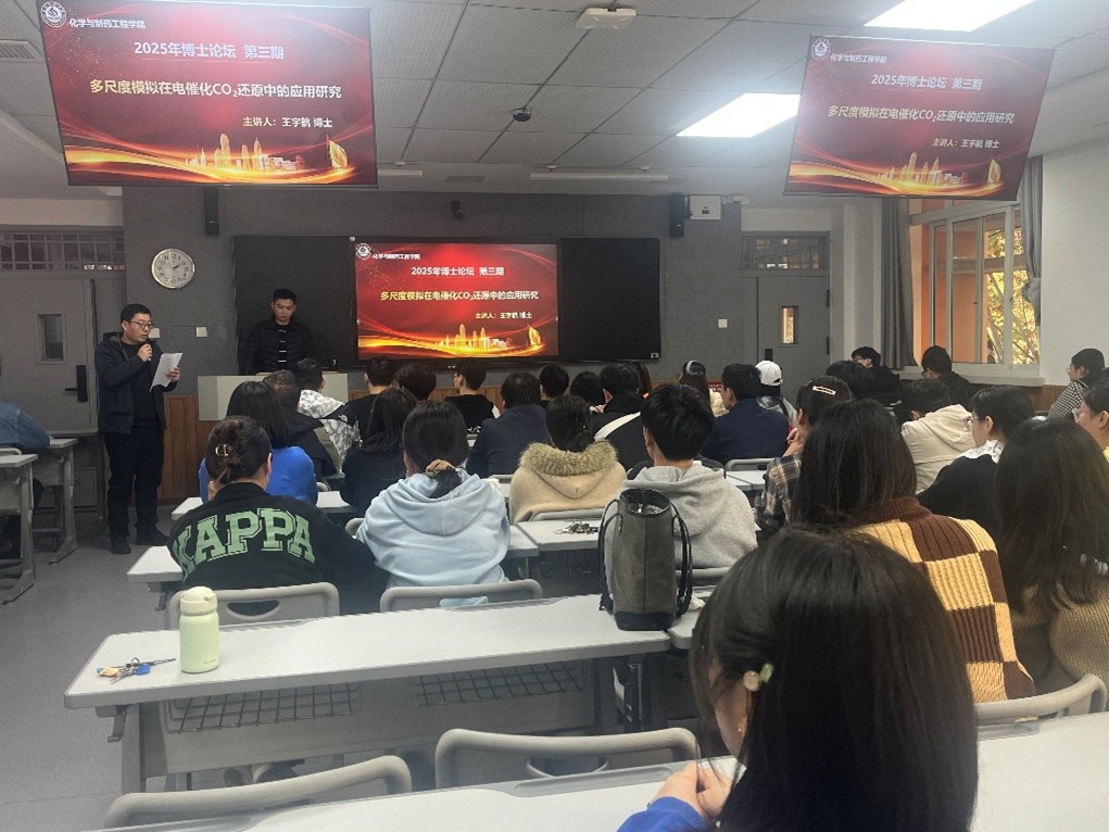 (本网讯 通讯员 刘启)11月5日,我院“2025年度博士论坛”第三期学术报告会于博睿楼215教室顺利举行。王宇航博士作了题为“多尺度模拟在电催化CO₂还原中的应用研究”的学术报告。学院副院长程新峰、教师代表、研究生及部分本科生参加了本次活动,报告会由程新峰主持。
