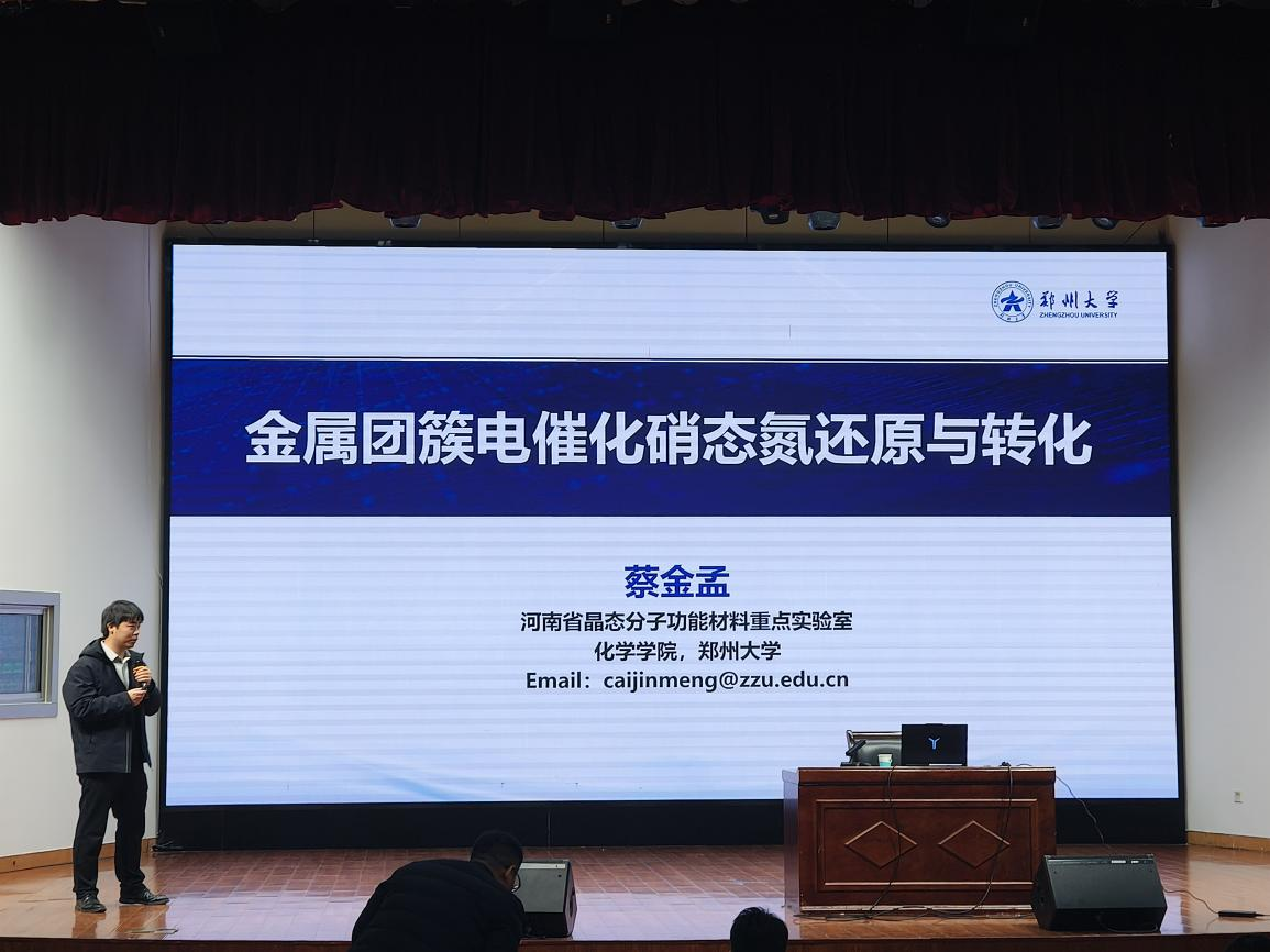 报告中,黄仁武教授围绕复合铜基团簇的可控制备、结构调控及其在催化甲烷转化中的应用展开系统阐述,重点介绍了基于富勒烯构建铜团簇结构、提升铜(I)团簇稳定性,以及通过异质团簇共价组装优化电催化甲烷转化性能等方面的研究成果。王朝阳教授聚焦于碳硼烷稳定的币金属团簇体系,详细讲解了“金属-硼簇”材料的定向制备策略,并深入探讨了多维组装与多团簇分级组装在调控材料光学与催化性能中的作用机理。蔡金孟教授则针对电催化硝态氮还原与转化领域,分享了新型金属团簇催化剂的构建策略与活性位点电子结构调控新方法,揭示了催化剂结构与反应选择性、效率之间的内在关联及关键中间体的作用机制,同时提出了该领域面临的高值化转化挑战与创新设计思路。