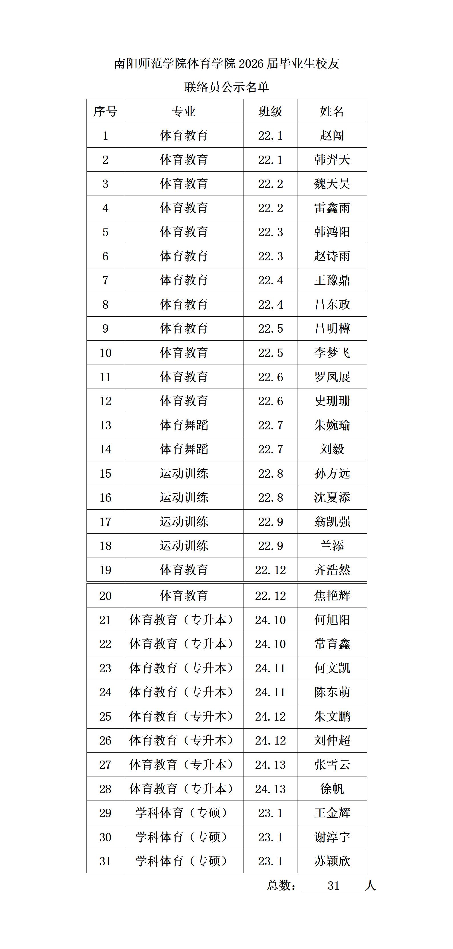 根据《南阳师范学院校友联络员聘任管理办法》的相关规定,拟从2026届毕业生中选拔有热情、有担当、有意向的同学,担任“南阳师范学院体育学院2026届毕业生校友联络员”,经个人申报,学院推荐,拟推荐以下31人,现予以公示,