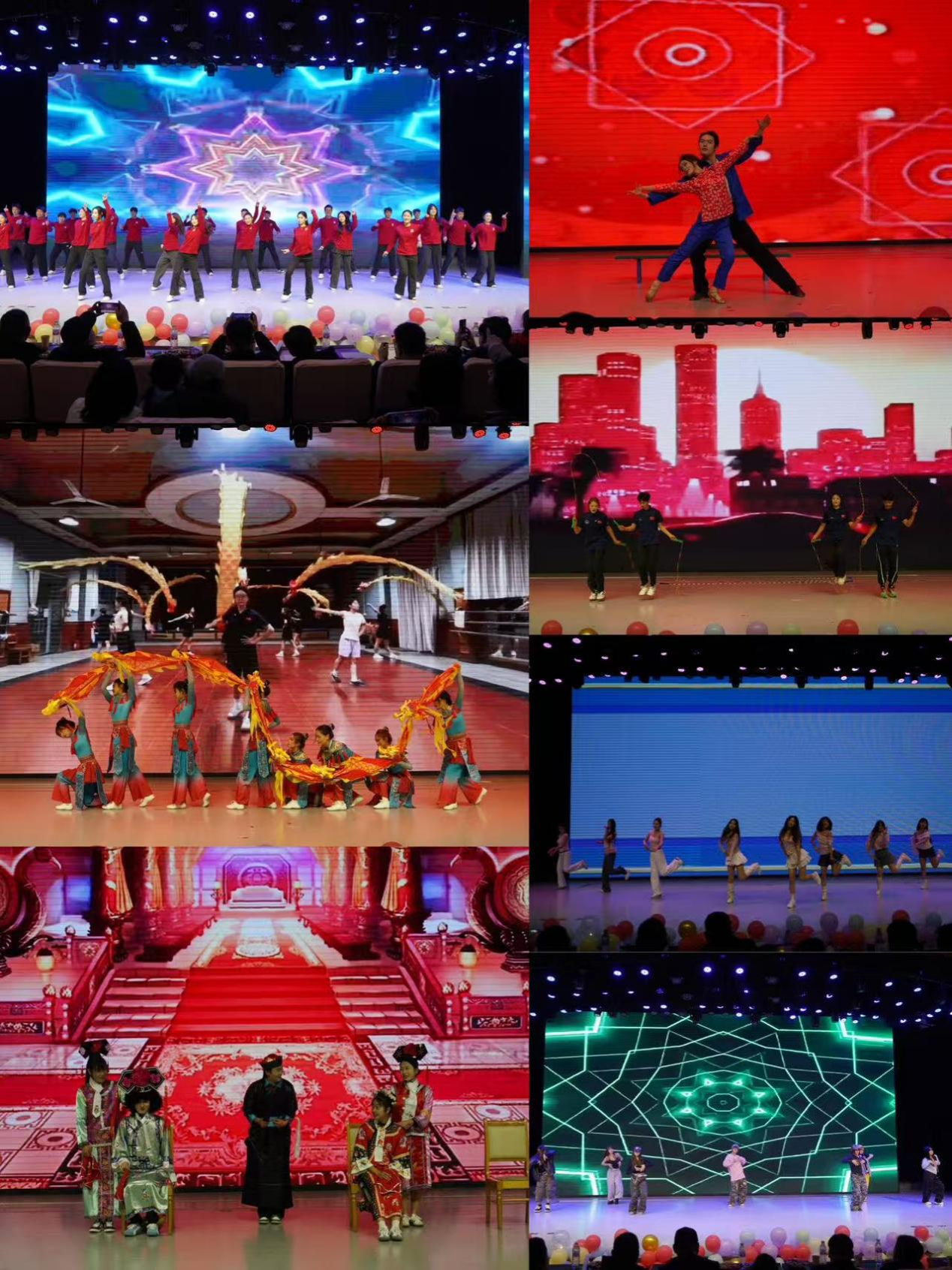 晚会在开场舞《Dance New Year》中拉开帷幕。朗诵《盛世中国》以铿锵有力的语调,抒发对祖国的无限热爱,字里行间满是青年学子的家国情怀;舞蹈《Young Girls》和《舞为舞生》展现了青春活力,爵士舞《Heymama》动感十足。小品《甄嬛后传》凭借幽默的台词、夸张的表演,将现场气氛推向小高潮,引得台下观众阵阵欢笑。舞蹈《依兰爱情故事》以温情的旋律和细腻的舞姿,传递出真挚的情感;歌曲《青春回响曲》用悠扬的歌声,唤起师生们对青春岁月的美好回忆。舞龙表演《龙舞颂仪》气势恢宏,龙身翻腾间尽显传统文化魅力;跳绳节目《欢乐绳舞迎正旦》将体育技能与艺术表演相结合,展现了体育学子的专业素养。歌曲《快乐霓虹序》节奏明快,充满活力;压轴舞蹈《相亲相爱》则由师生共同演绎,传递出体院大家庭的温暖。