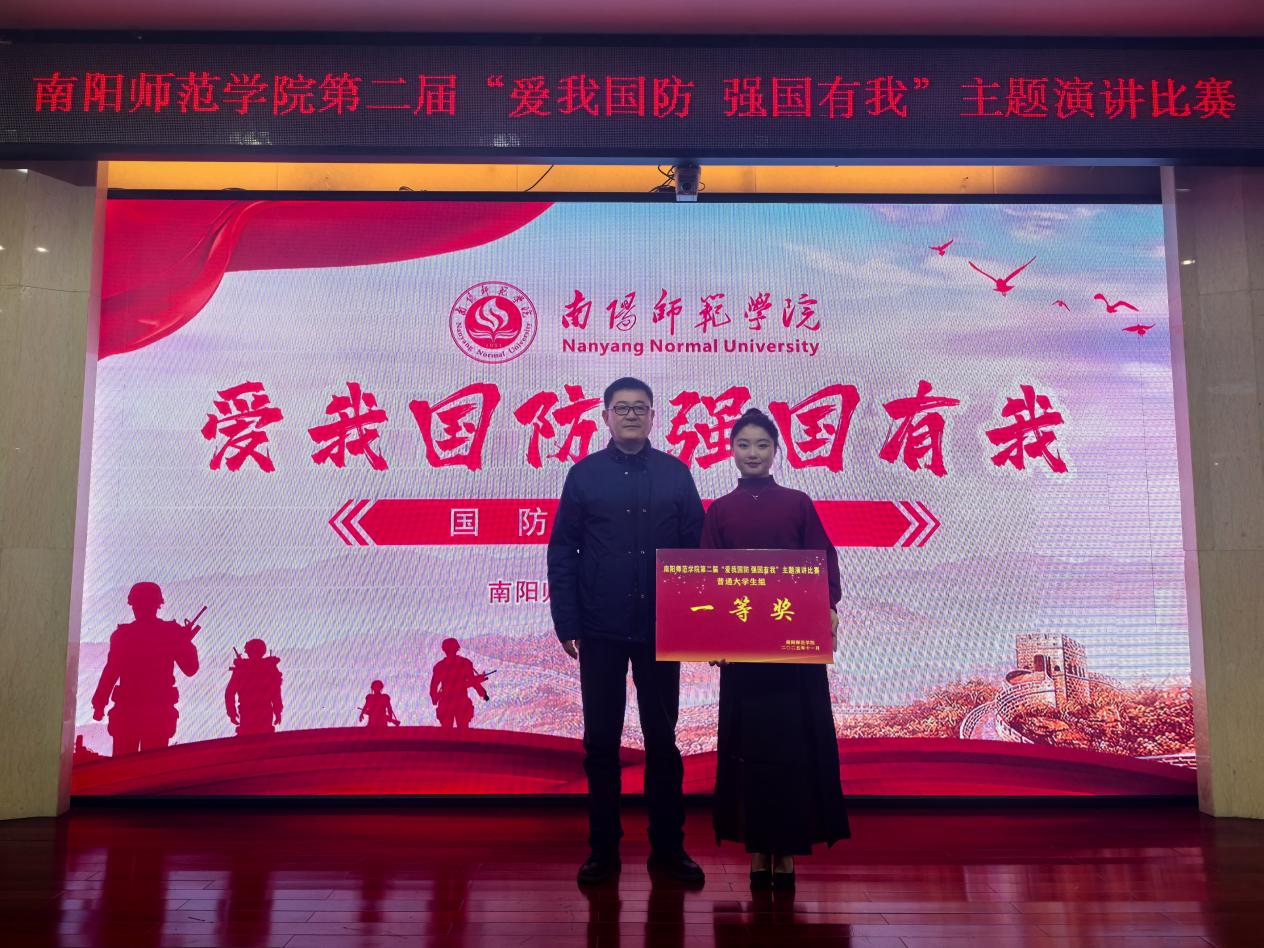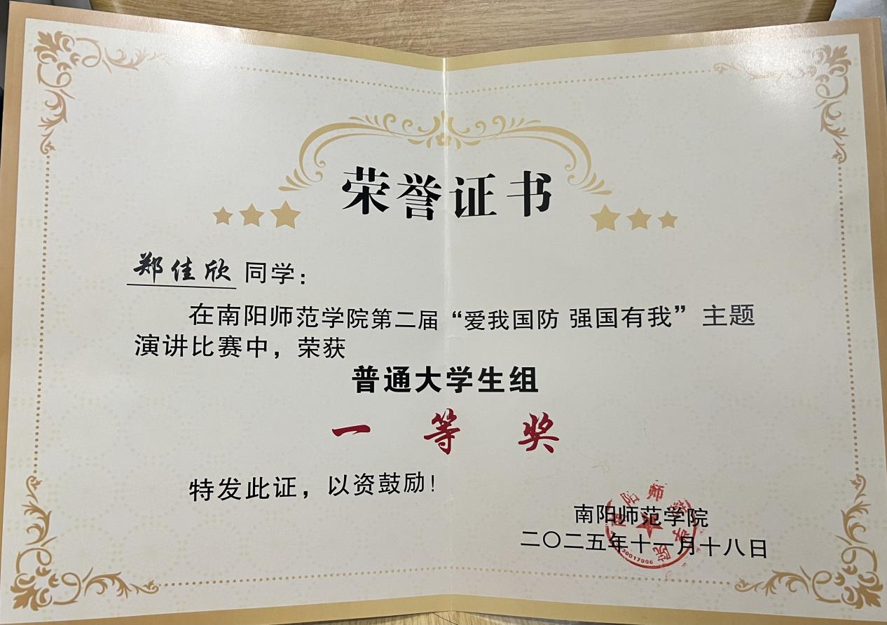 比赛分为普通大学生组和退役大学生组两个组别,全校145名参赛选手通过初赛、复赛两个阶段激烈角逐,最终18人进入决赛。通过专业评委严格评判,体育学院郑佳欣同学荣获普通大学生组一等奖,指导老师王一乐荣获优秀指导老师奖。郑佳欣同学的演讲作品《从青铜戈到青春誓:我们的国防传承课》以青铜戈为切入点,将“青铜戈的千年守护”与当代青年责任联结。以古今贯通的视角传递“小我护国安”的态度,用真挚表达与清晰逻辑获得评委好评。