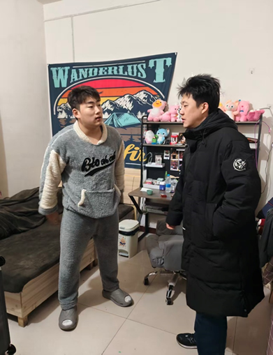 本网讯(通讯员 范紫豪)为保障学生校外安全,近日,我院组织辅导员对寒假期间,仍在校外住宿的学生情况进行精准摸排与关怀走访。各年级辅导员通过电话、线上方式逐一确认,排查出4名学生因校外兼职暂未返家。随即,辅导员巩丰伟对外宿学生进行了实地走访,细致查看其居住条件,叮嘱学生用电、防火及人身财产安全,提醒学生保持联系畅通,确保离宛前一切安好。