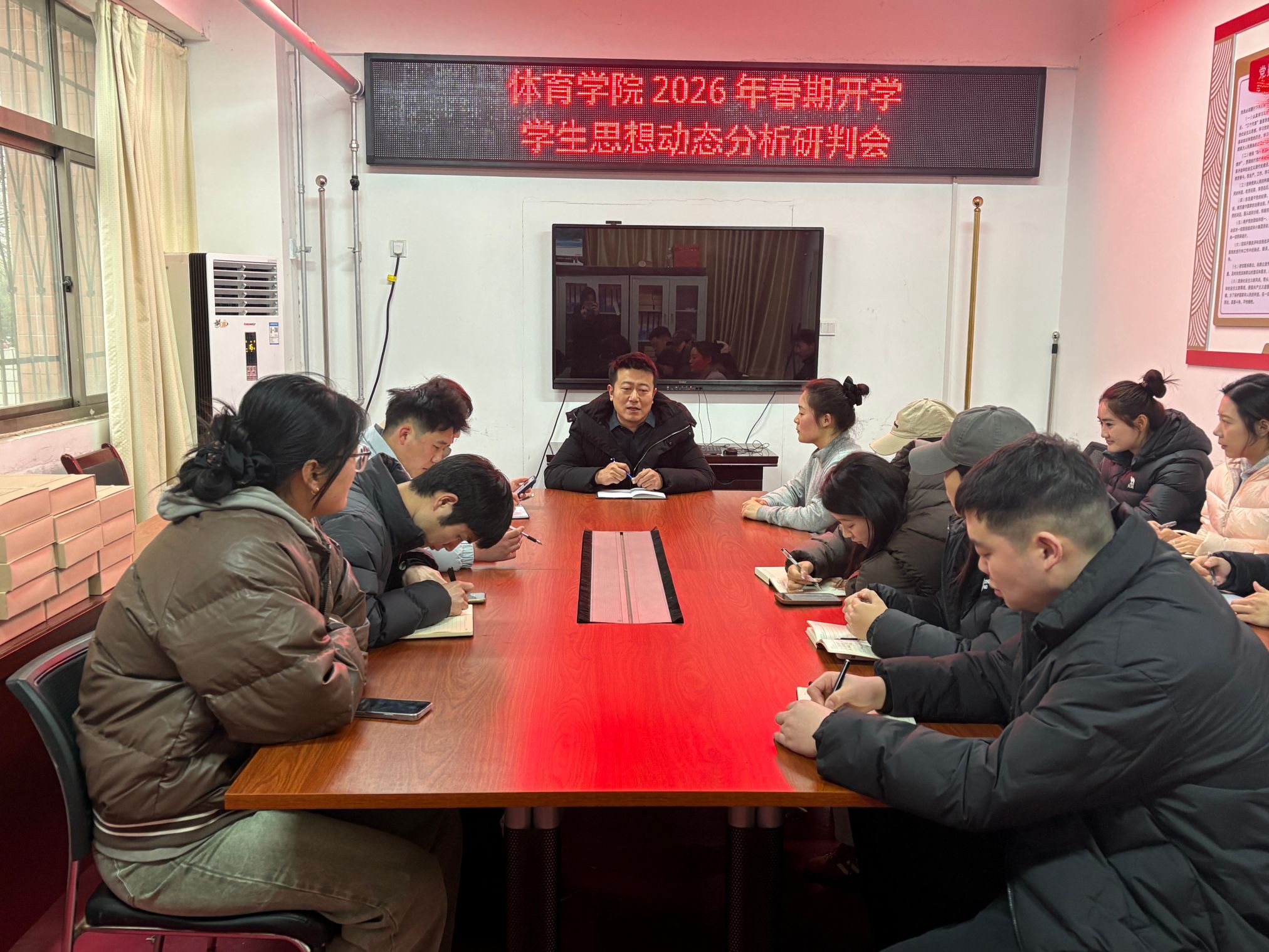 本网讯(通讯员 吕瑞贤 图/文)为精准把握学生返校后的思想动态,深入了解学生需求,科学谋划新学期学生工作,3月6日晚,体育学院学工队伍在107会议室召开2026年春期学生返校思想动态分析研判会。全体辅导员、学生会主席团参加会议,会议由学院党委副书记王一乐主持。