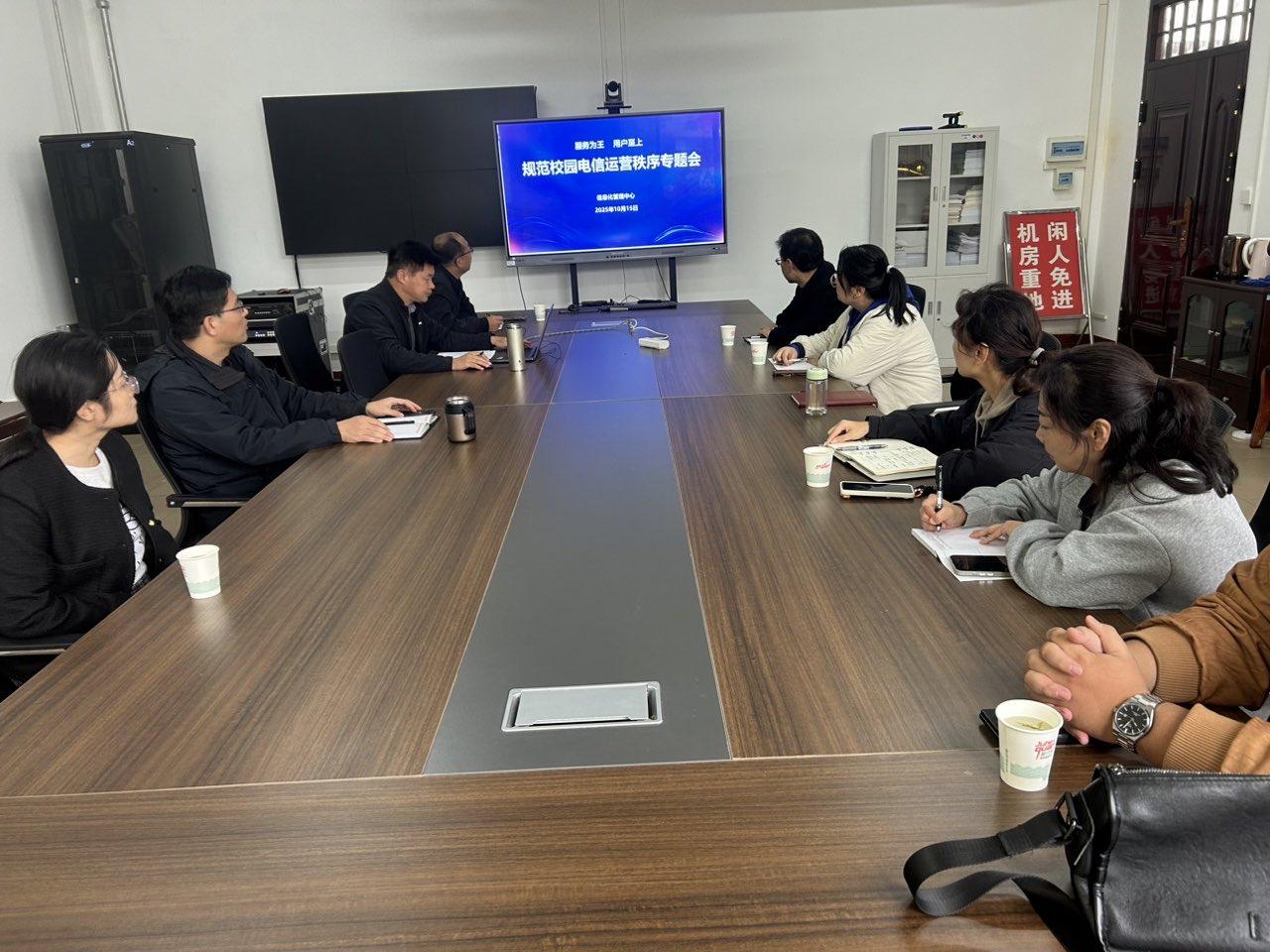 本网讯(通讯员文/图 冷贝贝)为进一步规范校园电信业务运营秩序、提升服务水平,切实回应师生关切,10月15日上午,信息化管理中心在东区图书馆208办公室召开专题会议。市区三家运营商(中国电信、中国移动、中国联通)校园部负责人、校园网运维人员参加会议,信息化管理中心科级以上人员出席。