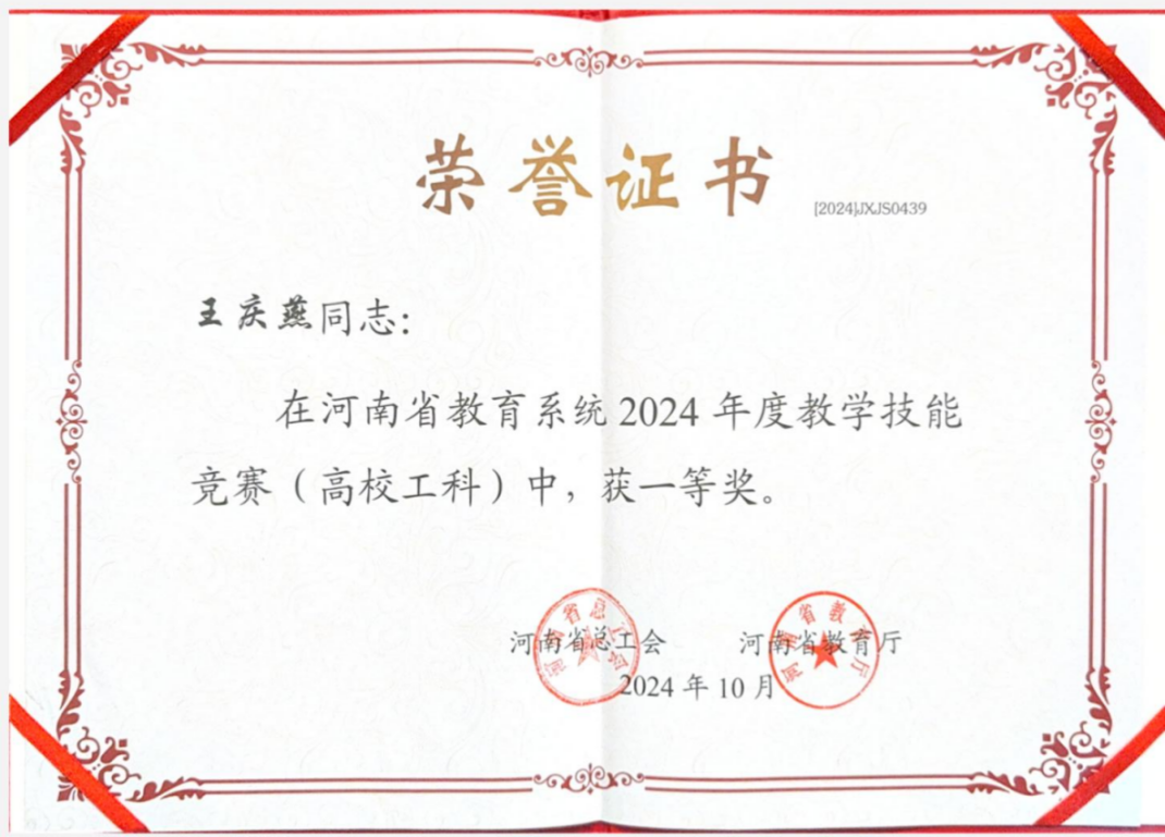 目前依托此课程,教学团队已荣获2024年度河南省教学技能竞赛一等奖、2025年度河南省教学课堂创新大赛二等奖两个省级奖项。