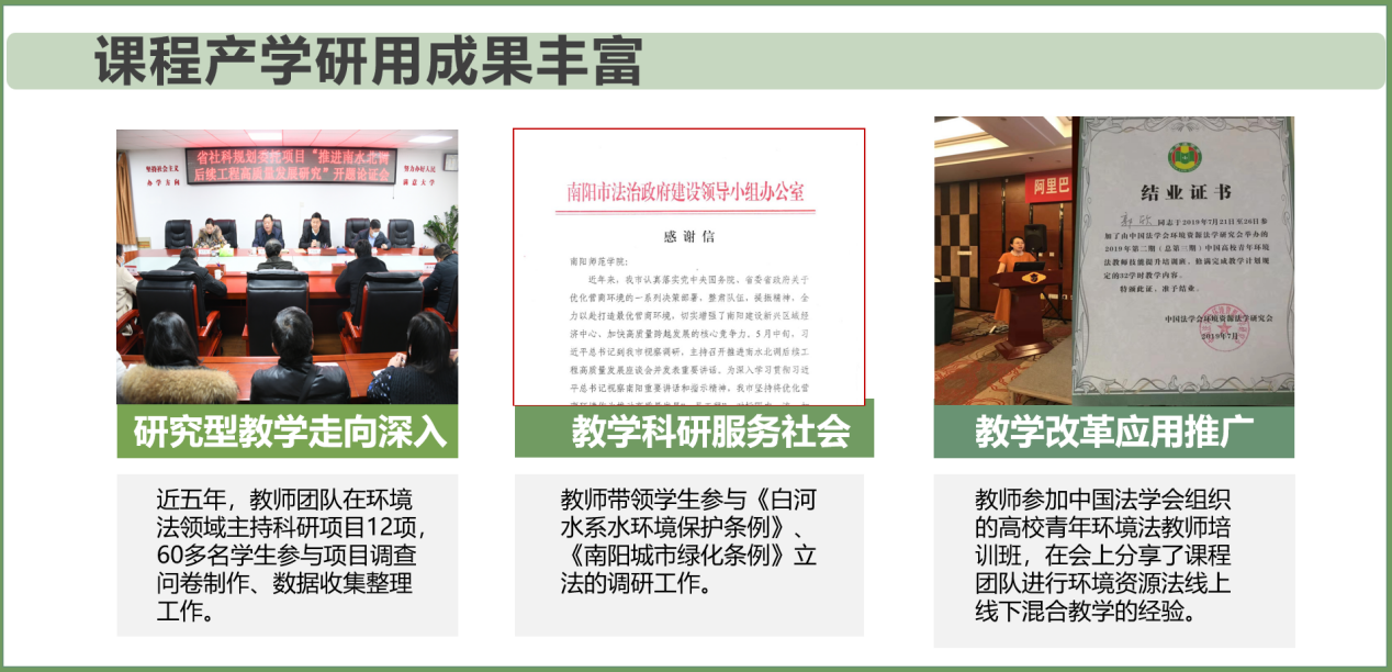 课程建设成果丰硕,团队教师带领学生参与了《白河水系水环境保护条例》《南阳市文物保护条例》等地方立法的调研起草工作。课程先后获评河南省线上线下混合式一流课程、河南省课程思政示范课程。