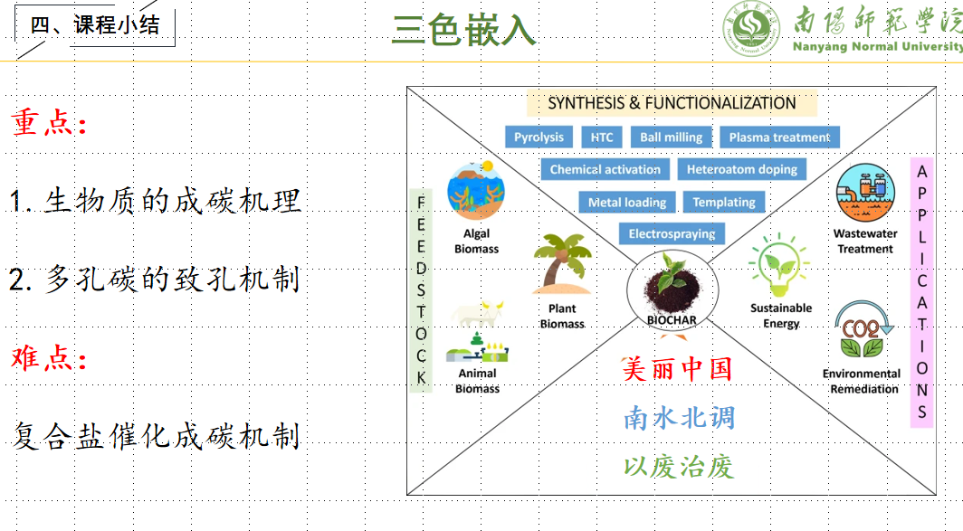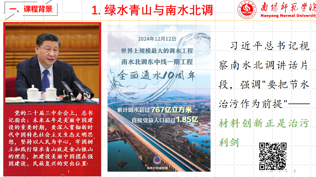 在新时代高等教育改革的背景下,南阳师范学院充分发挥南水北调中线工程渠首的地缘优势,以服务国家战略需求为导向,创新性地构建了“三色嵌入”(红色思政、蓝色科教、绿色生态)的人才培养模式。《新材料科学进展》课程作为材料化学专业的核心课程,紧扣学校“以水为魂”的育人理念,融入南水北调工程背后的生态伦理观与家国情怀,将先进碳材料、框架材料、膜材料、凝胶材料等前沿科学技术与能源、环境等领域的实际应用深度结合,探索出“学科前沿对接生态需求、课程思政融入专业教育、科教融合驱动创新实践”的教学创新体系。本课程注重的不仅是知识的传授,更强调价值观念的塑造、综合能力的培养以及实践能力的提升,以“绿水青山就是金山银山”理念为引领,培养学生“以废治废”的循环经济思维与“科技报国”的社会责任感。课程通过将材料科学理论与现实问题相结合,激发学生的学习兴趣和责任意识,使其在掌握学科前沿知识的同时,深刻理解材料科学在解决国家重大问题中的重要作用。