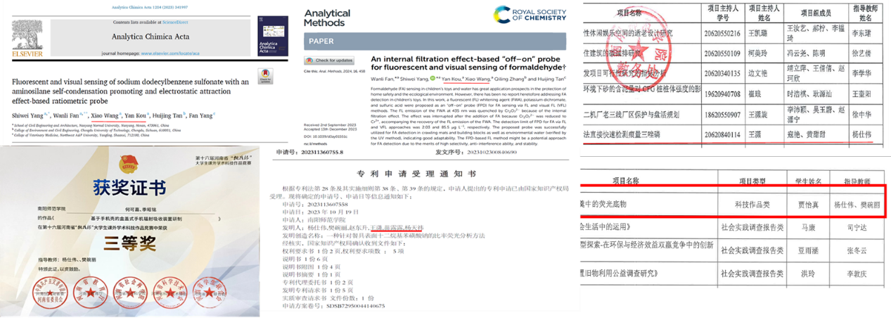 图1部分参赛获奖情况和学生参与发表论文、申请发明专利及主持SPCP和节能减排项目展示