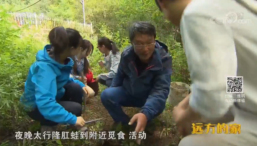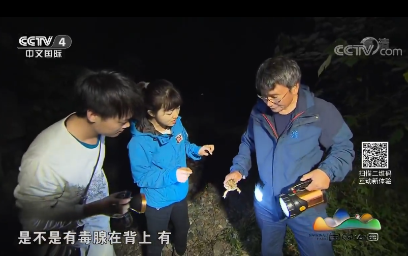 梁子安教授在宝天曼给央视记者介绍中华大蟾蜍