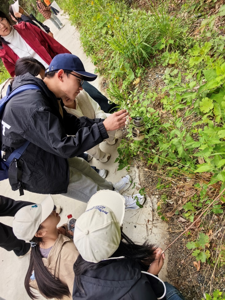 学生在伏牛山叶片下采集昆虫
