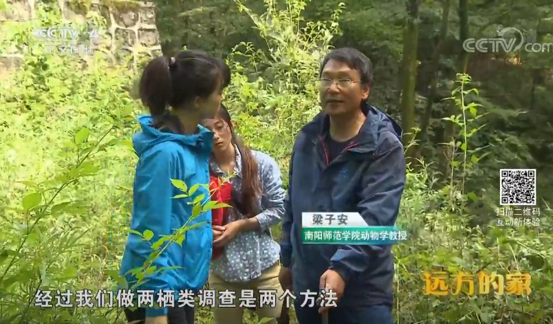 梁子安教授在宝天曼给央视记者介绍两栖类调查情况