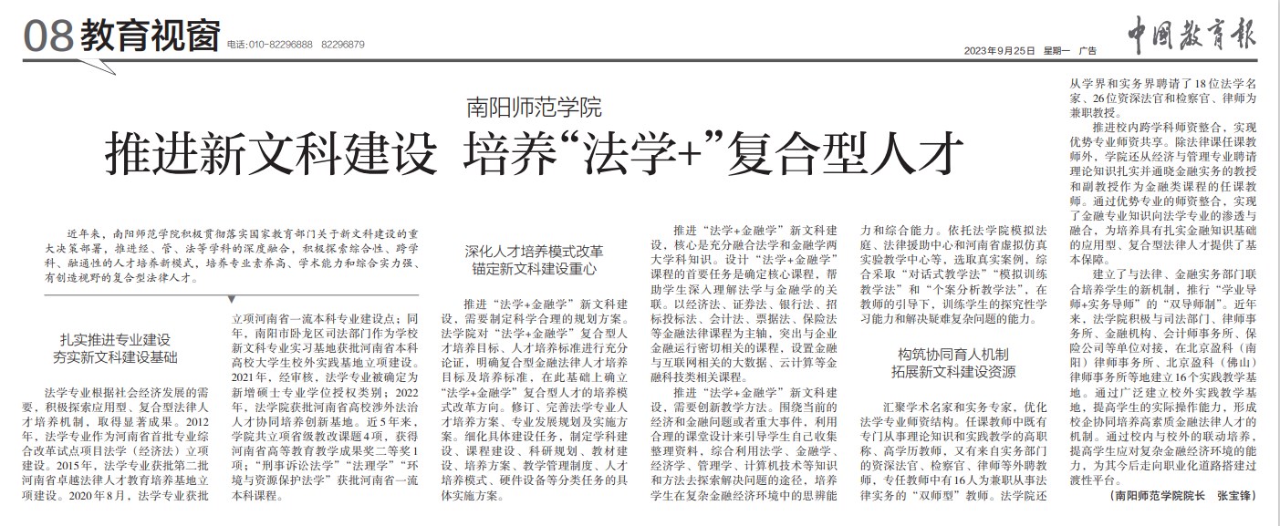 9月25日,《中国教育报》08版刊发南阳师范学院校长张宝锋的署名文章《南阳师范学院:推进新文科建设 培养“法学+”复合型人才》,现全文转载如下:近年来,南阳师范学院积极贯彻落实国家教育部门关于新文科建设的...