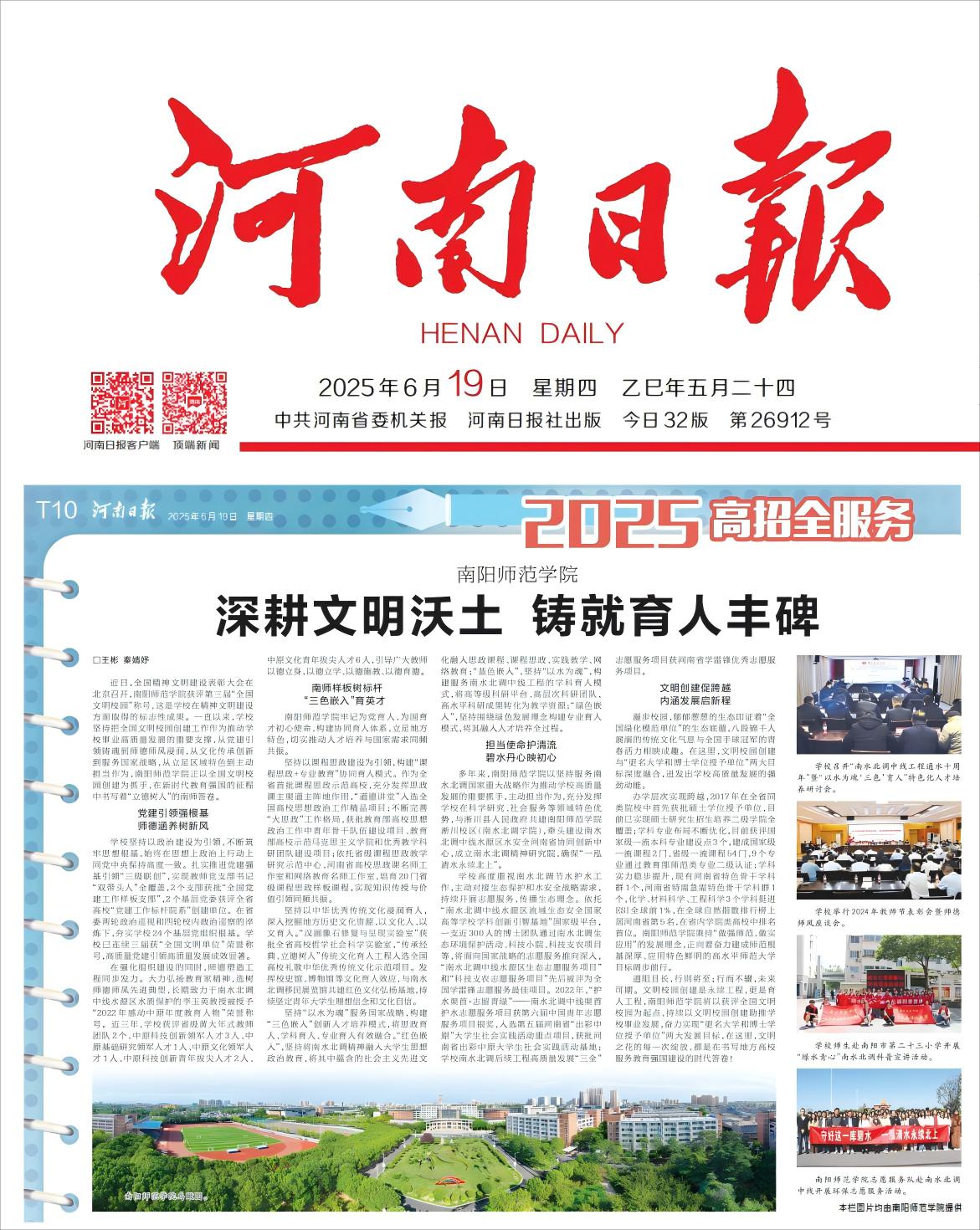 2025年6月19日,《河南日报》T10版刊发文章《南阳师范学院:深耕文明沃土铸就育人丰碑》,全文如下:近日,全国精神文明建设表彰大会在北京召开,南阳师范学院获评第三届“全国文明校园”称号,这是学校在精神文...