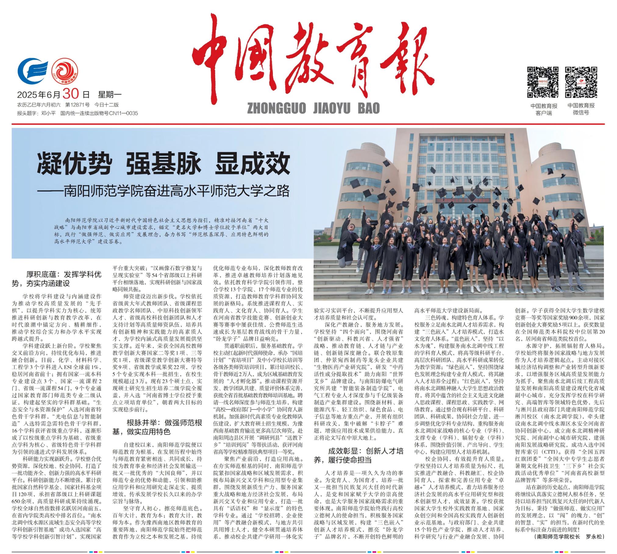 2025年6月1日,《光明日报》第4版刊发我校党委书记张宝锋的文章《南阳师范学院 :深耕师范守初心 创新应用践使命》,全文如下:在南水北调中线工程的源头,伏牛山南麓的沃土上,南阳师范学院这所拥有多年师范底蕴...
